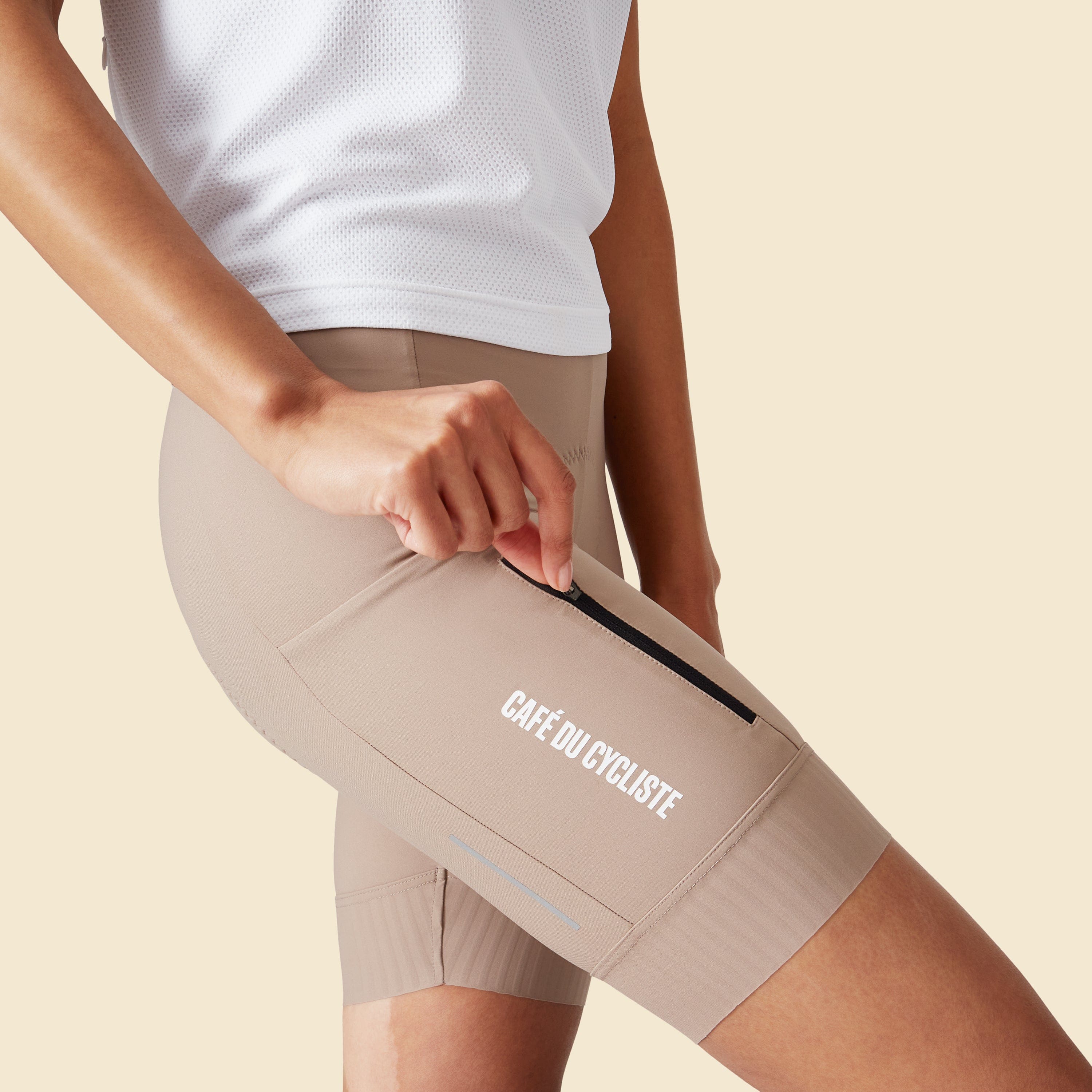 From using recycled nylon yarns to meeting OEKO-TEX® and Bluesign® standards, Elsa bib shorts exemplify Cafe du Cycliste's commitment to eco-friendly cycling apparel.